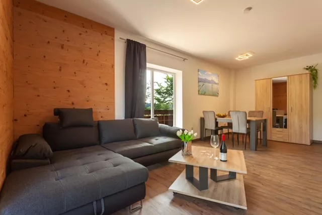 Das Wohn- und Esszimmer vereint geselliges Beisammensein mit einer voll ausgestatteten Küche und einem gemütlichen Schlafsofa.
